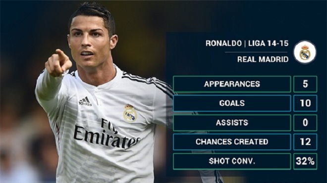 Một thống kê khác cũng chỉ ra phong độ ghi bàn ấn tượng của Ronaldo. Anh đang ghi bàn nhiều hơn 14 CLB ở La Liga mùa này và chỉ kém so với Barca (17 bàn), Valencia (13 bàn), Atletico (11 bàn) and Celta (11 bàn).