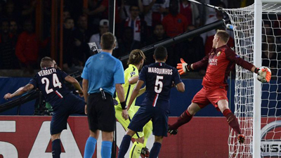 | Một cầu thủ có chiều cao khiêm tốn như Marco Verratti vẫn có thể hạ hàng phòng thủ Barcelona bằng một pha đánh đầu. |