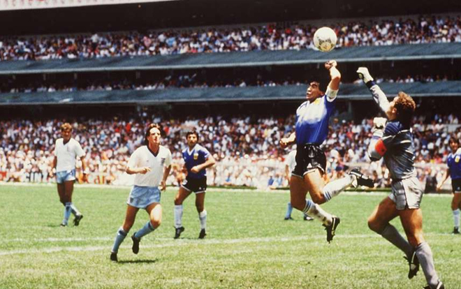 Maradona ghi bàn thắng gây tranh cãi nhất trong lịch sử bóng đá thế giới khi dùng tay đẩy bóng vào lưới tuyển Anh ở tứ kết World Cup 1986.