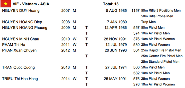 | Danh sách các xạ thủ Việt Nam tham dự giải đấu. |