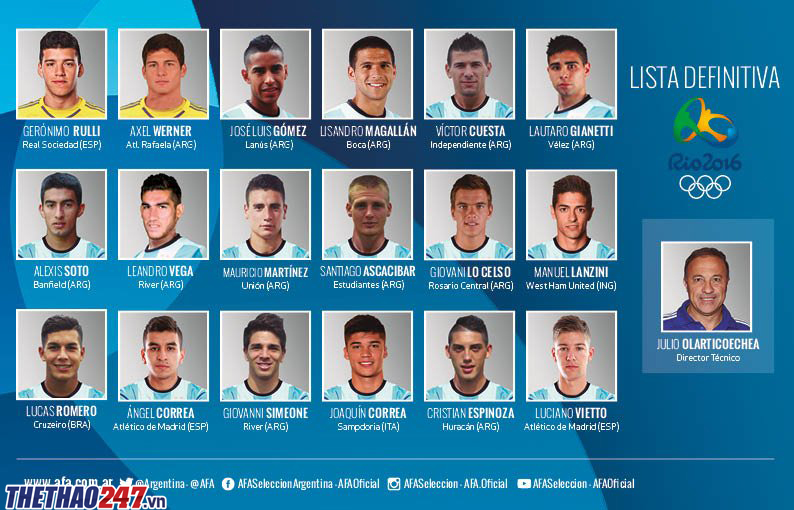 Danh sách 18 cầu thủ Argentina dự Olympic 2016