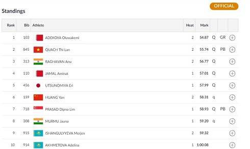 Thành tích 55 giây 74 của Quách Thị Lan tốt thứ 2 ở vòng loại sau VĐV Oluwakemi Adekoya người Bahrain (54 giây 87), kỷ lục của đại hội. Theo lịch vào lúc 18h45 ngày mai, Quách Thị Lan sẽ bước vào thi chung kết.