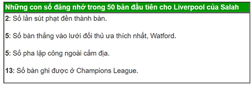 Trong 50 bàn đầu tiên cho Liverpool, Salah chỉ lập một hat-trick (thực tế là bốn bàn) vào lưới Watford hồi tháng 3/2018.