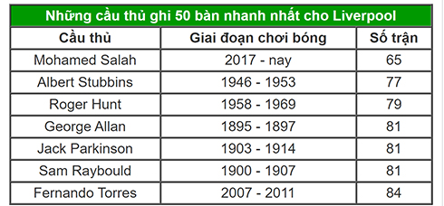 Người có thống kê này tốt nhất trước tiền đạo người Ai Cập là Albert Stubbins. Ông cần 77 trận để ghi 50 bàn trong thập niên 1940. Con số này của Salah là 65 trận.
