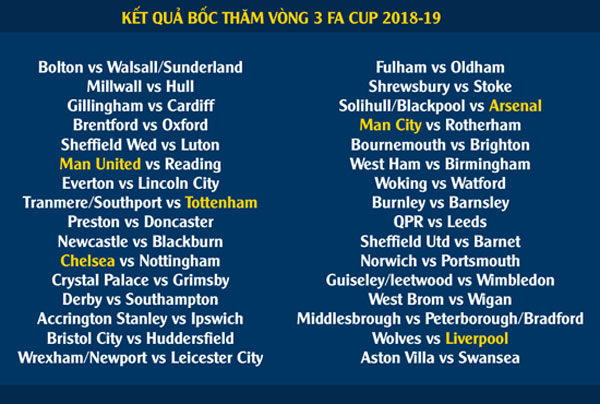 Hai đội bóng Bắc London, Tottenham và Arsenal dễ thở nhất ở vòng 3 FA Cup vì họ chỉ phải gặp các đội bóng từ hạng 3 trở đi. Cụ thể, Spurs sẽ gặp đội thắng trong cặp đấu giữa Tranmere Rovers (hạng 4) và Southport (hạng 6). Còn Arsenal sẽ gặp đội thắng trong cặp đấu giữa Solihull Moors (hạng 5) và Blackpool (hạng 3).