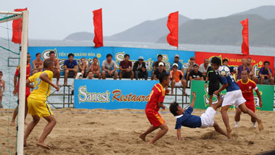 | Các vận động viên tranh tài ở môn bóng đá bãi biển tại Đại hội Thể dục thể thao toàn quốc lần 7 tại Nha Trang - Khánh Hòa. |
