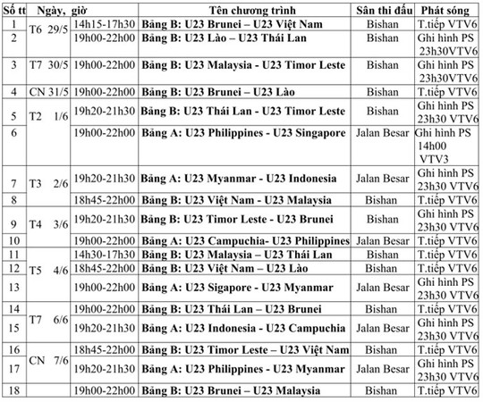 Đối vớinhững trận đấu của các đội cùng bảng với U23 Việt Nam, một số trận quan trọng sẽ được ghi hình và phát lại vào lúc 23 giờ 30 phút cùng ngày. Bên cạnh đó, VTV cũng sẽ THTT các trận đấu đáng chú ý ở bảng A, 2 trận bán kết, trận tranh HCĐ và trận chung kết.