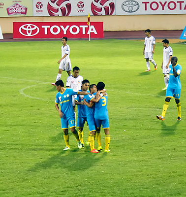 | Niềm vui của Quốc Chí và các đồng đội sau bàn thắng. |