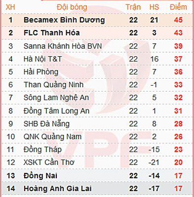 Bảng xếp hạng V-League sau vòng đấu 22: