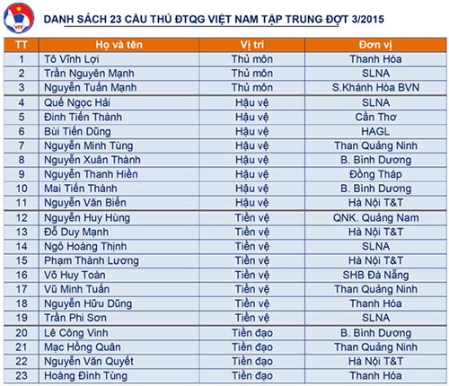 HLV Toshiya Miura vừa công bố danh sách đội tuyển bóng đá Việt Nam chuẩn bị cho trận đấu vòng loại World Cup 2018 gặp Đài Loan (TQ) trên sân khách.