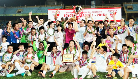 | Hà Nội T&T - đội bóng liên quan đến bầu Hiển - ăn mừng chức vô địch V-League 2016 |