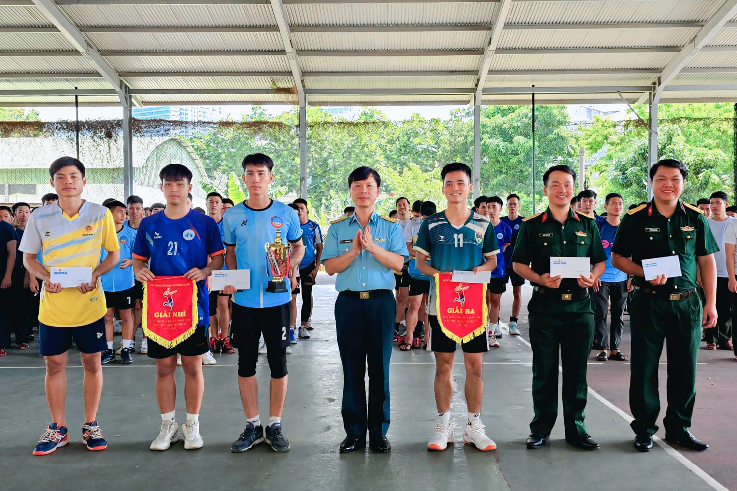 | Đại tá Vũ Hồng Trung - Phó Chính ủy Trường Sĩ quan Không quân trao giải cho các đội tuyển. |