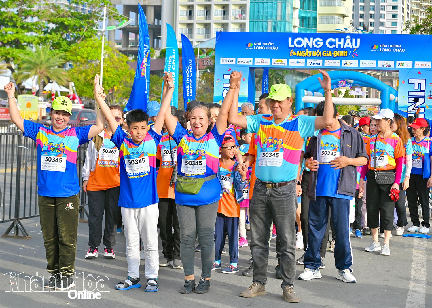 | Một gia đình trong niềm vui về đích sau khi cùng nắm tay nhau hoàn thành chặng đường 1km. |