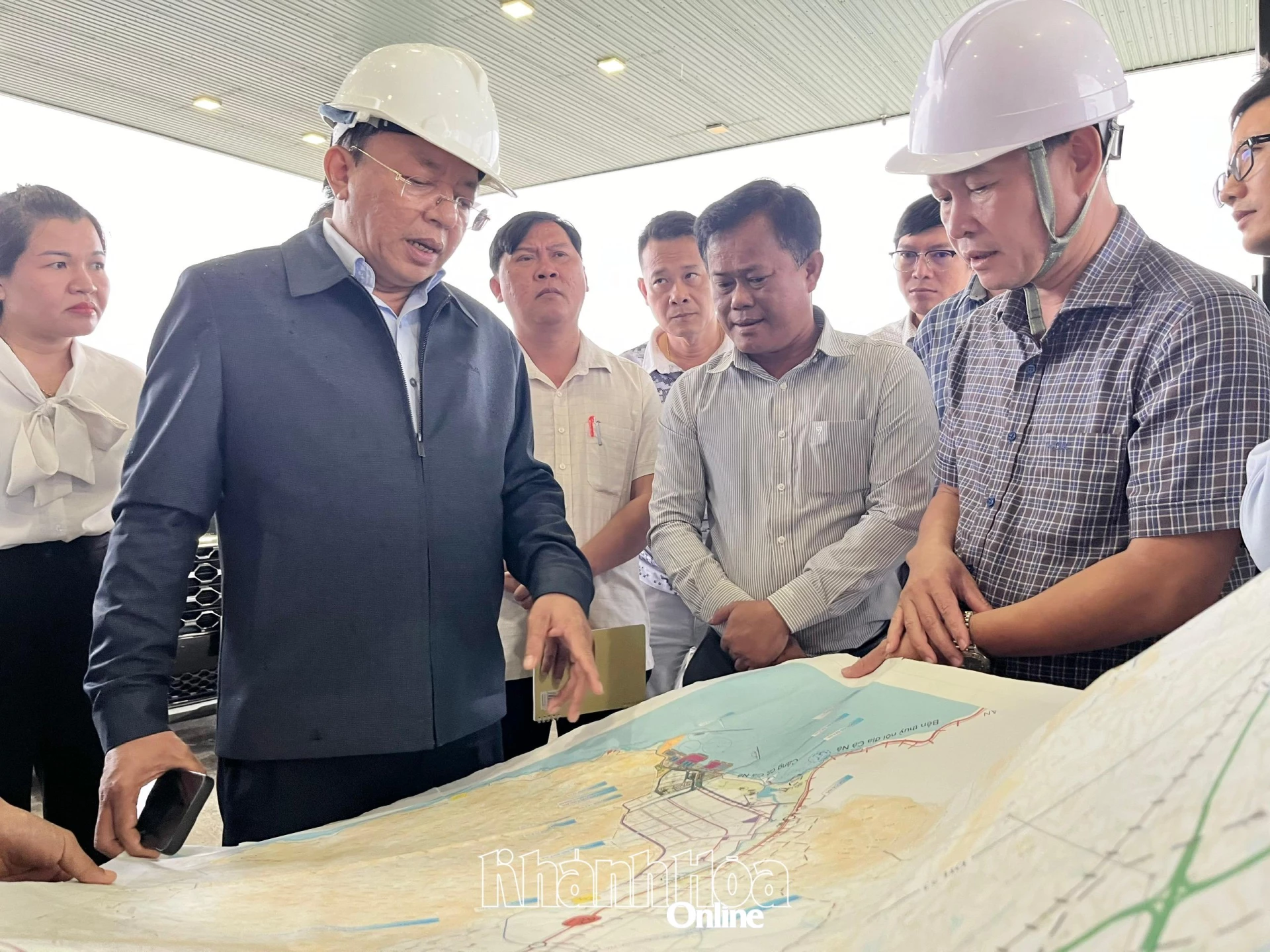 | Phó Chủ tịch UBND tỉnh Lê Huyền trao đổi với lãnh đạo địa phương về Dự án thành phần 2 đoạn từ Quốc lộ 1 đến Cảng biển tổng hợp Cà Ná. |