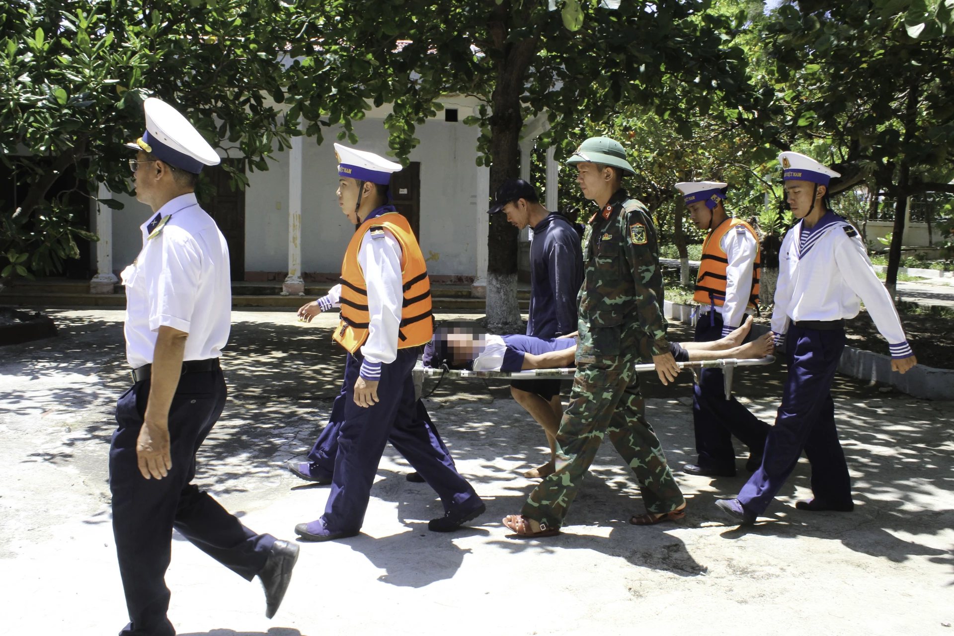 | Cán bộ, chiến sĩ vận chuyển bệnh nhân vào bệnh xá đảo cấp cứu. |