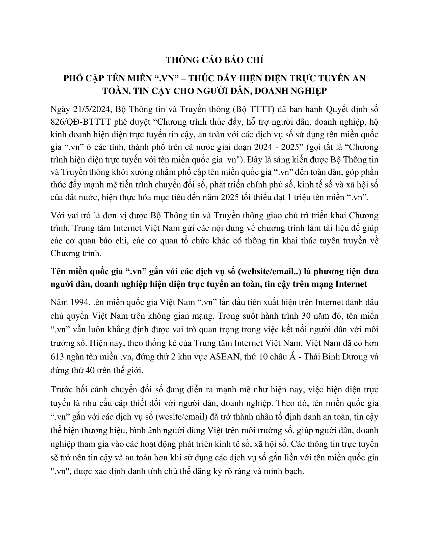 Phổ cập tên miền ".vn" - Thúc đẩy hiện diện trực tuyến an toàn, tin cậy cho người dân, doanh nghiệp