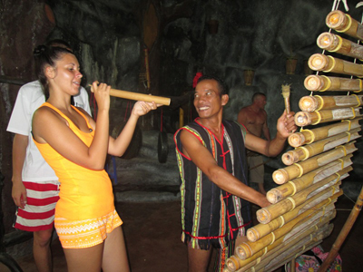 Còn với James, 34 tuổi, du khách đến từ Anh thể hiện sự phiêu của mình bằng việc chơi nhạc cụ Raglai. Được một cô gái Raglai hướng dẫn chơi đàn đá, James rất phấn khích. Ánh mắt anh không bỏ qua bất cứ một động tác nào của cô gái. Rồi lần đầu tiên James được chơi đàn đá. Tiếng đàn đá đầu tiên của James vang lên khiến mọi người... cười nghiêng ngả. Với bản thân, James coi âm thanh phát ra từ đàn đá đáng để khám phá. Anh bày tỏ: “Chơi được nhạc cụ của người Raglai không dễ chút nào. Có lẽ tôi nên thường xuyên đến nơi này để học được cách chơi một loại nhạc cụ nào đó, nhất là đàn đá”.