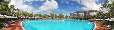 Lưng tựa vào khách sạn được thiết kế độc đáo hình vòng cung, tầm nhìn hướng ra biển, hồ bơi rộng hơn 5.000m2 tại Vinpearl Phú Quốc được lựa chọn là nơi tổ chức vòng thi Người đẹp biển.