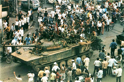 | Nhân dân Sài Gòn vui mừng chào đón đoàn quân giải phóng. (Ảnh tư liệu) |