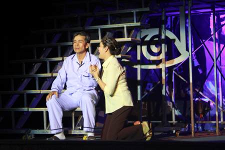 | NSƯT Nhật Lệ (bên trái) vai ông Tường trong vở dân ca kịch Người cha. |