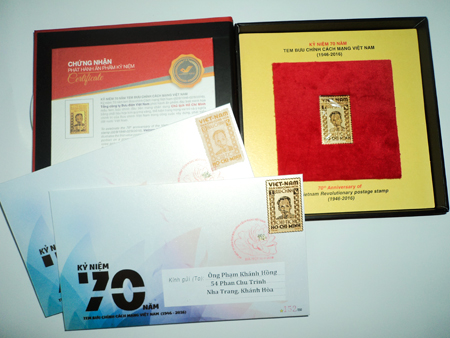 Tổng Công ty Bưu điện Việt Nam vừa phát hành ấn phẩm đặc biệt mẫu tem bưu chính đầu tiên (2-9-1946) mang chân dung Chủ tịch Hồ Chí Minh bằng chất liệu hợp kim mạ vàng 24 carat, trọng lượng 17gram/tem, số lượng 700 tem được đánh số seri từ 1 đến 700.