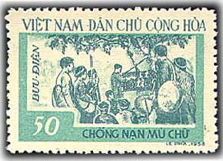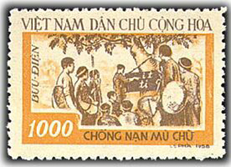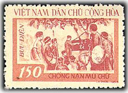 . Bộ tem đầu tiên “Chống nạn mù chữ” phát hành ngày 6-1-1958 do họa sĩ Lê Phả thiết kế được in offset 2 màu, gồm 1 mẫu 3 tem có mệnh giá: 50đ màu xanh, 150đ màu nâu, 1000đ màu vàng. Hình ảnh trên tem là lớp học ngoài trời của nông dân Việt Nam. Đây là mẫu tem đặc biệt vì thời điểm đó đất nước còn rất nhiều khó khăn nhưng vẫn thể hiện sự quan tâm của Chính phủ trong việc coi trọng giáo dục thông qua chủ trương lớn “Diệt giặc dốt”, đẩy mạnh công tác bình dân học vụ.