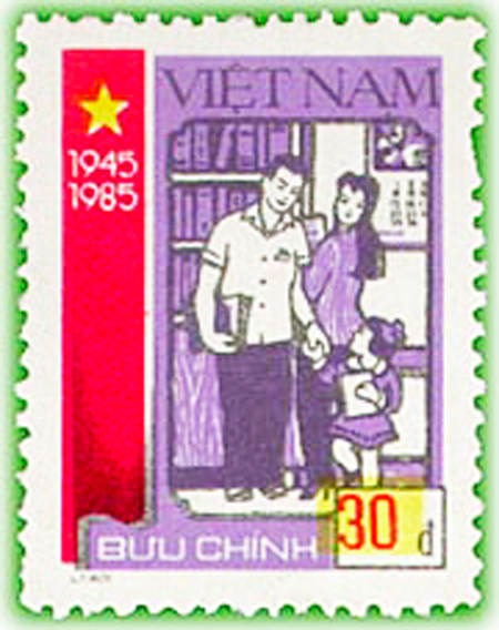 . Mẫu tem số 1686 mệnh giá 30đ trong bộ tem “Kỷ niệm 40 năm Quốc khánh Việt Nam” phát hành ngày 6-2-1985 do họa sĩ sinh Lê Thanh Đức thiết kế. Mẫu tem đã nói lên tầm quan trọng của ngành Giáo dục trong việc kiến thiết đất nước.