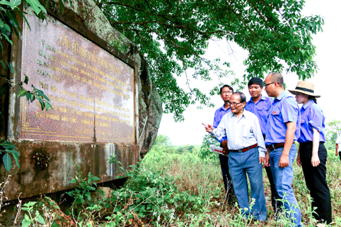 Chụp ảnh lưu niệm tại bia di tích căn cứ địa Suối Thơm - Hòn Dữ.