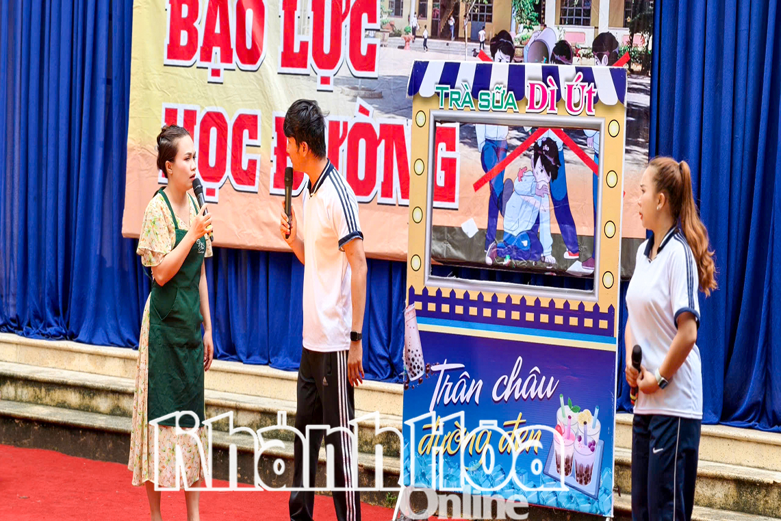 Ngày 10-3, tại Trường THCS Trần Nhân Tông (huyện Diên Khánh), các thành viên Đội Tuyên truyền lưu động (thuộc Trung tâm Văn hóa - Điện ảnh tỉnh Khánh Hòa) thực hiện chương trình văn nghệ truyền thông phòng, chống bạo lực học đường.