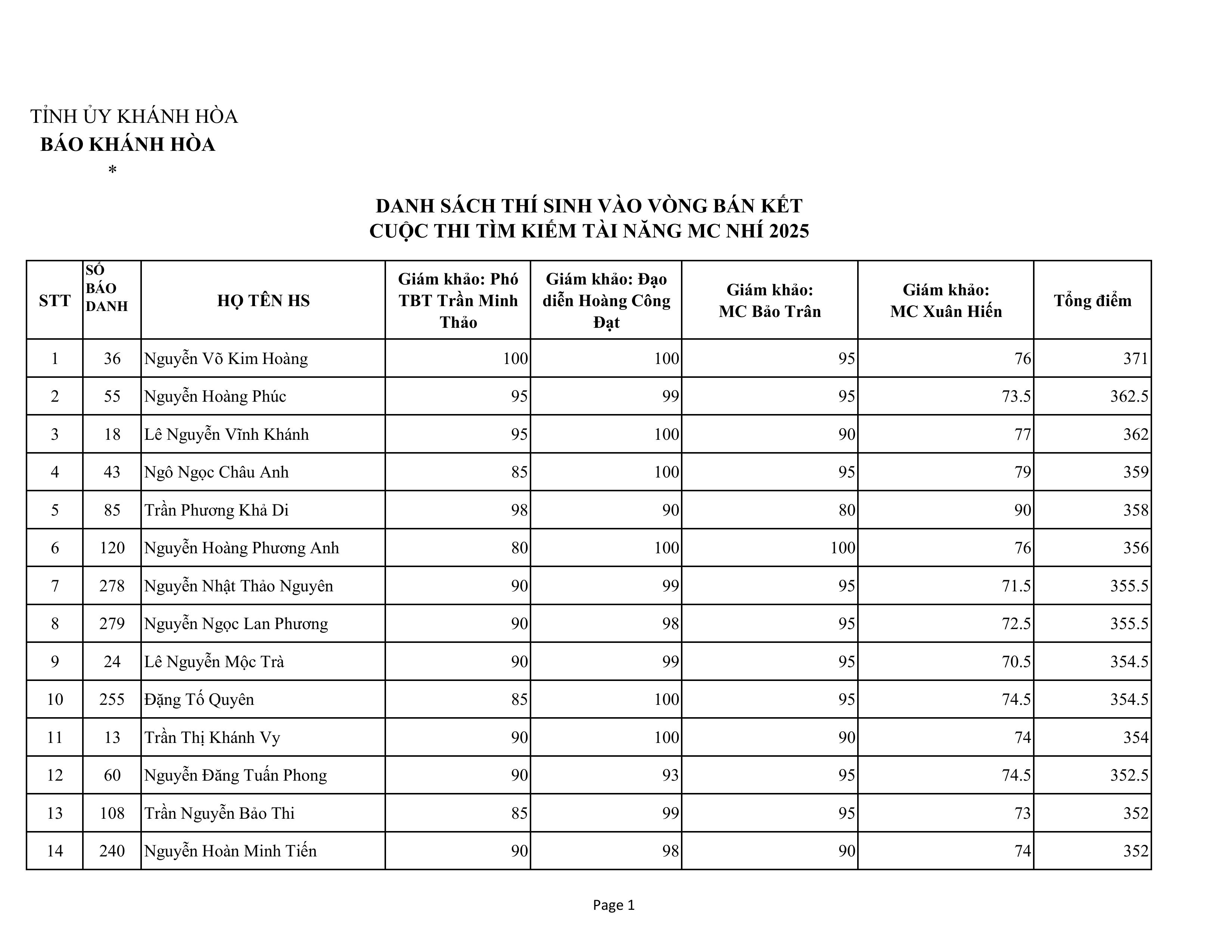 Sau 2 ngày tranh tài sôi nổi, cuộc thi "Tìm kiếm tài năng MC Nhí 2025" đã tìm ra được 89 gương mặt xuất sắc dành quyền vào vòng bán kết, sẽ được tổ chức vào cuối tháng 6 tới. Báo Khánh Hòa công bố danh sách và gửi đến quý gia đình các thí sinh toàn bộ hình ảnh các em thể hiện năng khiếu của mình tại cuộc thi.