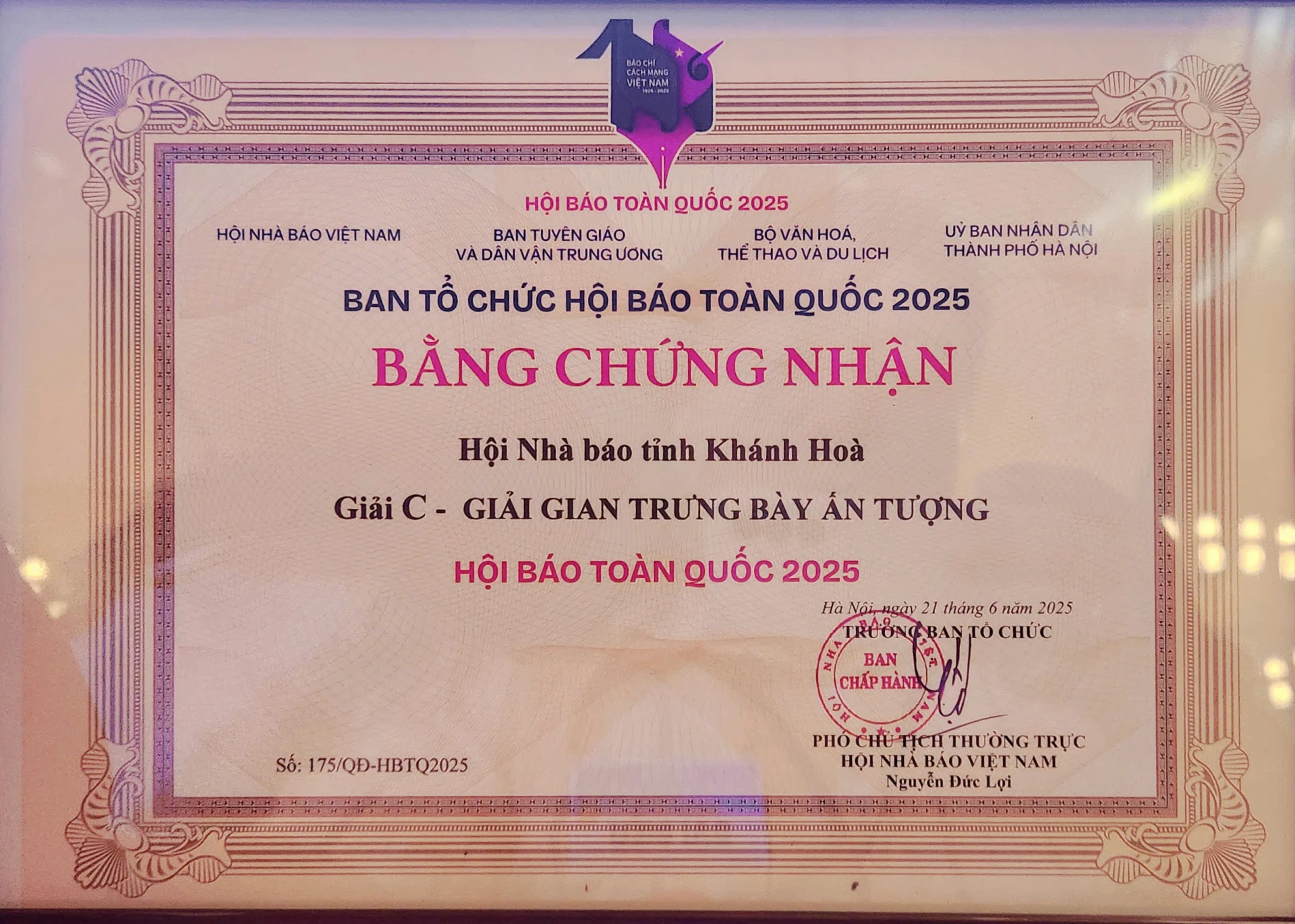 | Lãnh đạo Hội Nhà báo tỉnh Khánh Hòa (thứ 2 từ trái qua) nhận giải C gian trưng bày ấn tượng tại Hội báo toàn quốc 2025. |