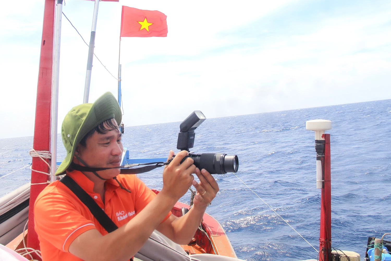 | Phóng viên Thanh Long tác nghiệp trên ngư trường thực hiện loạt bài "Theo cờ Tổ quốc vươn khơi". |
