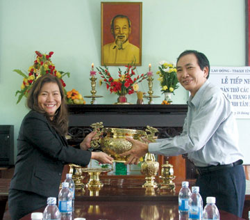 | Bà Nguyễn Thị Thanh Hương, Giám đốc Công ty TNHH Thương mại và Du lịch Tâm Hương (trái) trao tặng bộ linh khí, bàn thờ các anh hùng liệt sĩ tại Nghĩa trang Hòn Dung cho lãnh đạo Sở Lao động - Thương binh và Xã hội. |