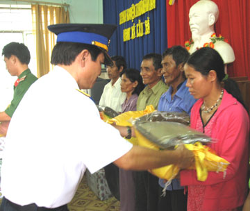 | Đại tá Đinh Văn Nghiêm - Phó Chỉ huy trưởng pháp luật Cảnh sát biển 4 Cục Cảnh sát biển Bộ Quốc phòng tặng quà cho gia đình chính sách thuộc xã Cầu Bà, huyện Khánh Vĩnh, Khánh Hòa |