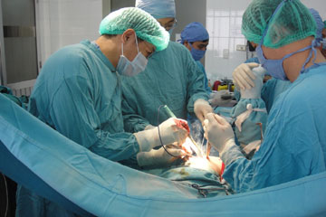 | Giáo sư Aree Tanavalee (trái) phẫu thuật thị phạm một ca bệnh tại Bệnh viện Đa khoa tỉnh. |