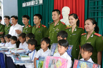 | Các chiến sĩ, đoàn viên thanh niên Công an tỉnh thăm và tặng quà cho các em học sinh tại đảo Bích Đầm. |