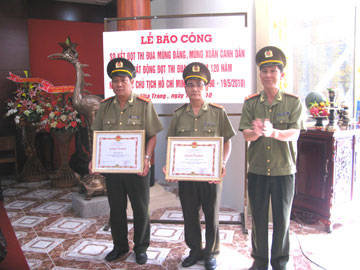 | Đại tá Trần Quang Họa, Giám đốc Công an tỉnh (bìa phải) trao bằng khen của UBND tỉnh cho các tập thể đạt nhiều thành tích trong đợt cao điểm. |