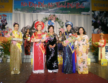 | Bà Hồ Thị Phương Chi - Chủ tịch Hội Liên hiệp Phụ nữ TP. Nha Trang (giữa) trao giải cho các thí sinh. |