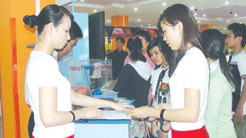 | Khách hàng nghe giới thiệu các dịch vụ 3G Mobi Fone tại TT Thương mại Maximark Nha Trang |