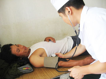 | Bác sĩ Quân y đảo Nam Yết kiểm tra sức khỏe cho ngư dân Nguyễn Ngọc Hồng. |