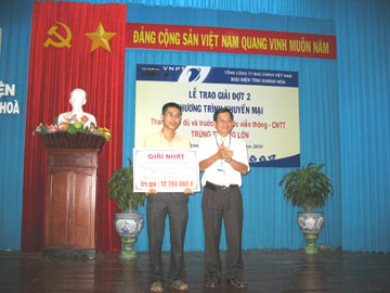 Bưu điện tỉnh Khánh Hòa vừa tổ chức tổng kết và trao giải đợt 2 chương trình khuyến mãi “Thanh toán đủ và trước hạn cước viễn thông, công nghệ thông tin - Trúng thưởng lớn” cho 26 khách hàng may mắn trúng thưởng.