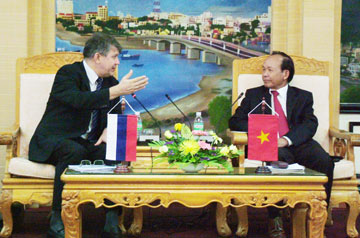 | Ông Võ Lâm Phi - Phó Bí thư Tỉnh ủy, Chủ tịch UBND tỉnh (bìa phải) tiếp ngài Andrey G.Kovtun - Đại sứ đặc mệnh toàn quyền Liên bang Nga tại Việt Nam. |