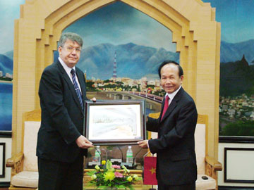 | Ông Võ Lâm Phi - Phó Bí thư Tỉnh ủy, Chủ tịch UBND tỉnh (bìa phải) tặng quà lưu niệm cho ngài Andrey G.Kovtun - Đại sứ đặc mệnh toàn quyền Liên bang Nga tại Việt Nam. |