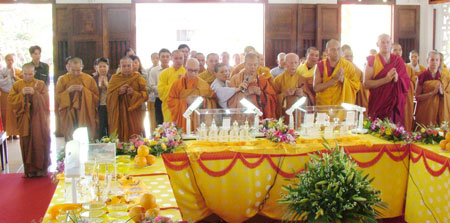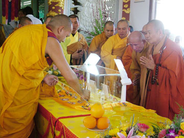 | Chư hòa thượng, thượng tọa chiêm bái Xá lợi Phật. |