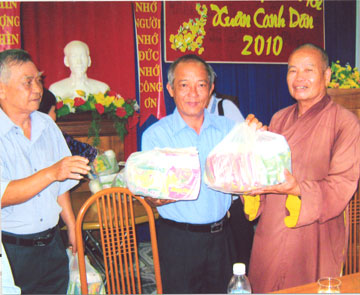 | Hòa thượng Thích Quảng Thiện - Trưởng ban Từ thiện xã hội Phật giáo Khánh Hòa (bên phải) tặng quà tại Trung tâm Điều dưỡng và chăm sóc người có công tỉnh. |