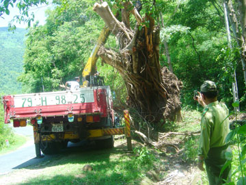 Sáng 17-6, lực lượng chức năng huyện Cam Lâm (Khánh Hòa) tiến hành cẩu gốc cây sộp cổ thụ có đường kính 2m, cao khoảng 3m do lâm tặc đào trộm (tại khu vực rừng cách Km19 - Tỉnh lộ 9 khoảng 20m) nhưng không vận chuyển được do gốc cây quá nặng.
