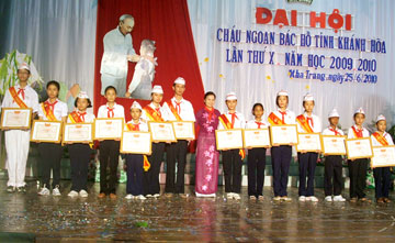 Sáng 25-6, 120 Cháu ngoan Bác Hồ tiêu biểu đại diện cho gần 109.000 Cháu ngoan Bác Hồ trong toàn tỉnh đã hội tụ tại Nhà Thiếu nhi tỉnh để dự lễ báo công Đại hội Cháu ngoan Bác Hồ tỉnh Khánh Hòa lần thứ 10, năm học 2009 - 2010.