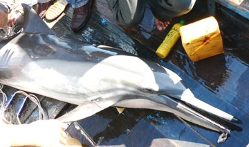 | Lực lượng cứu hộ đã đưa chú cá heo lên ghe để chở ra giữa vịnh Nha Trang để thả về biển. |