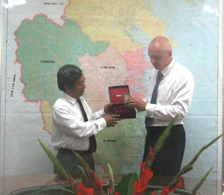| Ông Lê Xuân Thân - Phó Chủ tịch UBND tỉnh Khánh Hòa nhận quà lưu niệm từ Đoàn đại biểu chính quyền thành phố Sankt-Peterburg. |