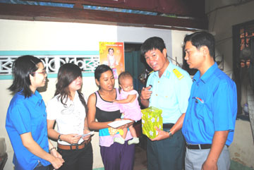 | Đoàn viên Chi đoàn Báo Khánh Hòa cùng đại diện Tiểu đoàn 1 Trường Sĩ quan Không quân và đại diện Công ty Cổ phần Tập đoàn Mai Linh Nam Trung Bộ và Tây Nguyên trao tiền và quà cho gia đình cháu Ngô Thị Ngọc Trâm. |